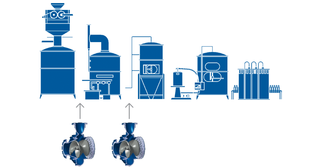 In this process normally a bearing frame pump in a horizontal arrangement is used. The type of drive depends on local conditions. Both flexible couplings and belt drives can be supplied.