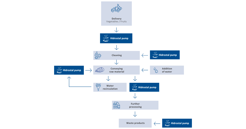 Hidrostal pumps are successfully used for the damage-free transportation, efficient feeding, pitting and washing of fruit and vegetables. Suitable feeders are also available to support the processes.