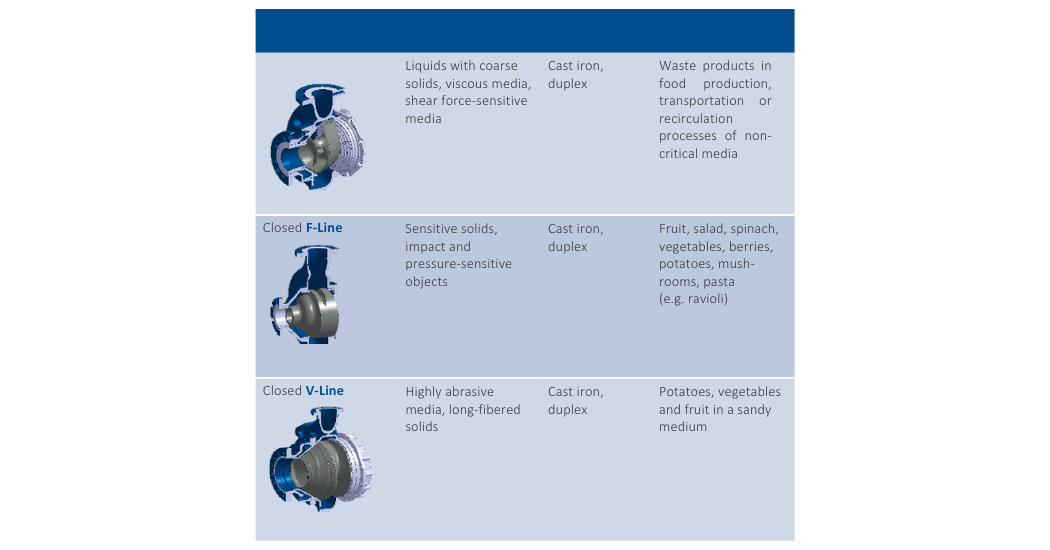 The original Hidrostal screw centrifugal impellers are available in various designs, depending on the requirements of the medium to be pumped. They guarantee non-clogging for all applications and gentle pumping for sensitive foodstuffs, always in combination with the high efficiency and long service life of the pumps.