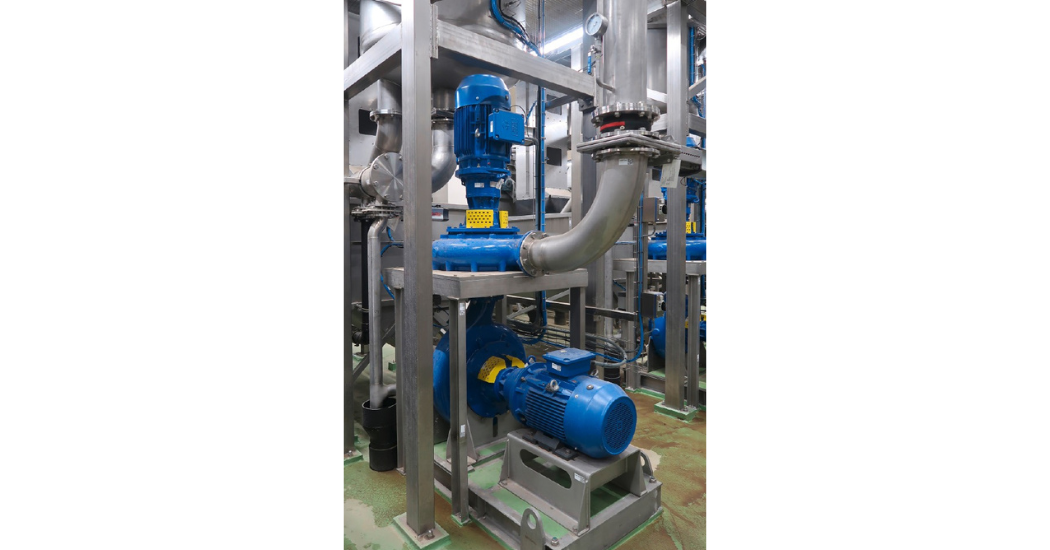 Washed spinach leaves are fed into the pumps via a feeder and then transported to the third floor, 24 m (78.7 ft) high, for further processing via a 3-stage pump system. There, the pumped water is separated from the spinach and returned to the feeder for reuse. Every hour, 5000 kg (11’023 lbs) of highly delicate spinach leaves are pumped with 300 m³ (79’252 gal) of water. Thanks to the gentle conveying with our type F impeller, this process can be mastered without any problems.