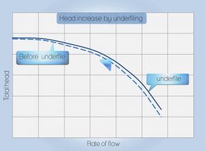 Underfiling is also used to increase the pump head versus flow (H-Q) performance. This can be thought of as either increasing head or increasing flow. The potential for increasing head can be in the range of a few percent to as much as 10%. Underfiling or overfiling may also bump up the pump efficiency a bit – usually not more than 0.5%.